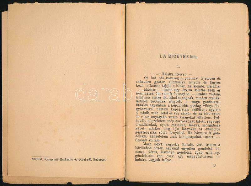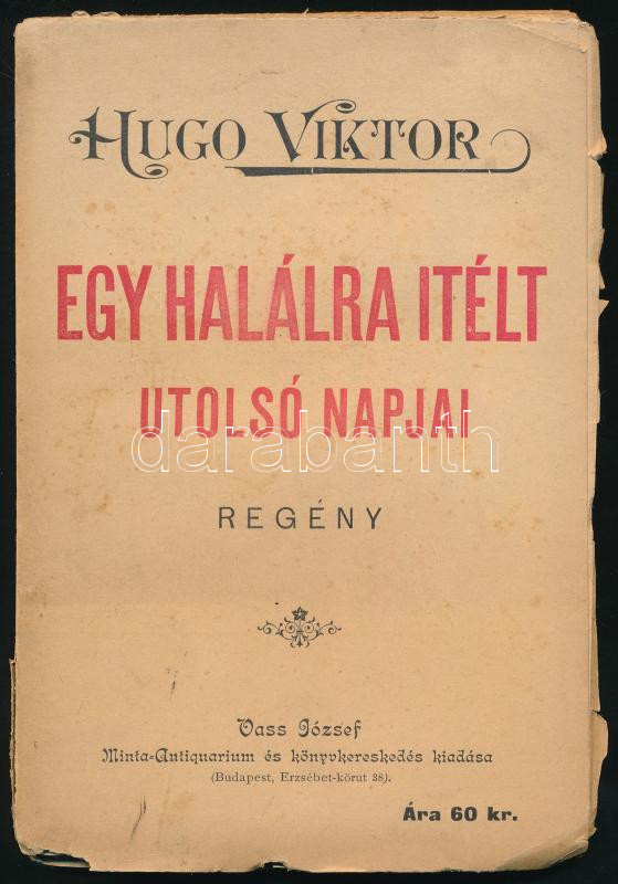 Hugo, Victor: Egy halálra ítélt utolsó napjai. Ford.: Andor Imre. Bp., [1903], Vass József (Markovits és Garai-ny.), 77 p. Kiadói papírkötés, sérült, kissé foltos borítóval, helyenként sérült lapszélekkel, részben felvágatlan lapokkal.