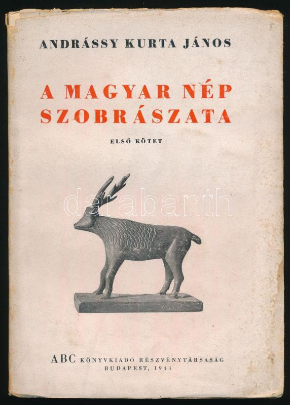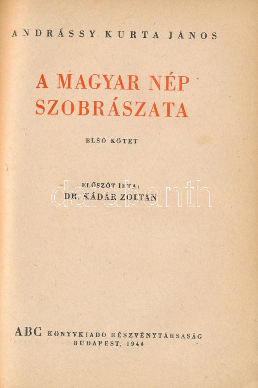 Andrássy Kurta János: A magyar nép szobrászata. I. köt. (Unicus!) Dr. Kádár Zoltán elÅ‘szavával. Bp., 1944, ABC, 68+(6) p. + LXXVI t. (fekete-fehér képtáblák). ElsÅ‘ kiadás! Kiadói papÃrkötés, kissé sérült, foltos papÃr védÅ‘borÃtóban, az utolsó néhány lap sérült, helyenként ázásnyomokkal.