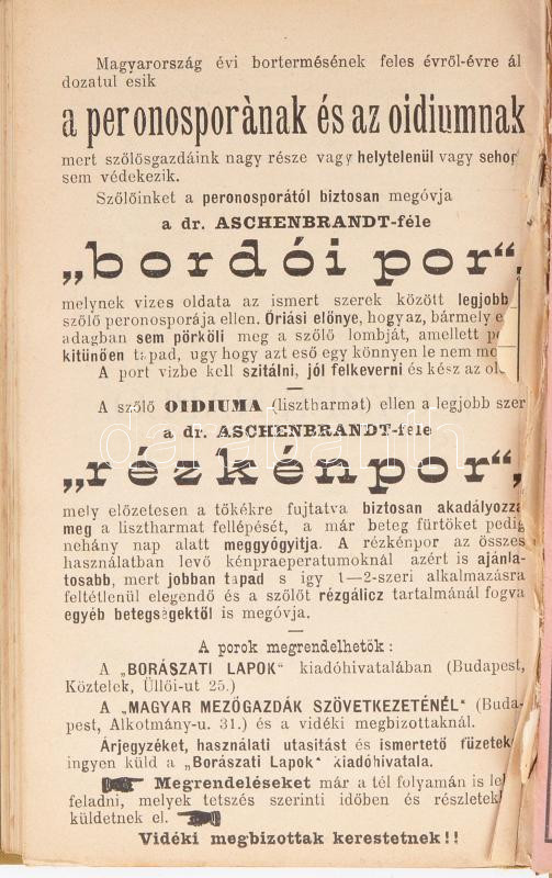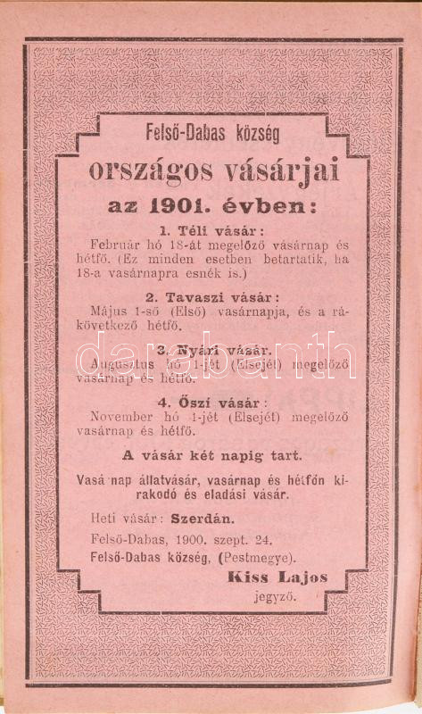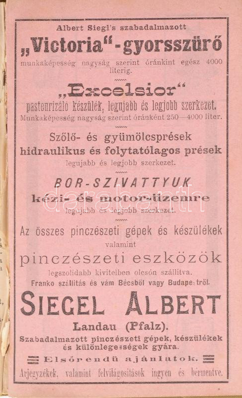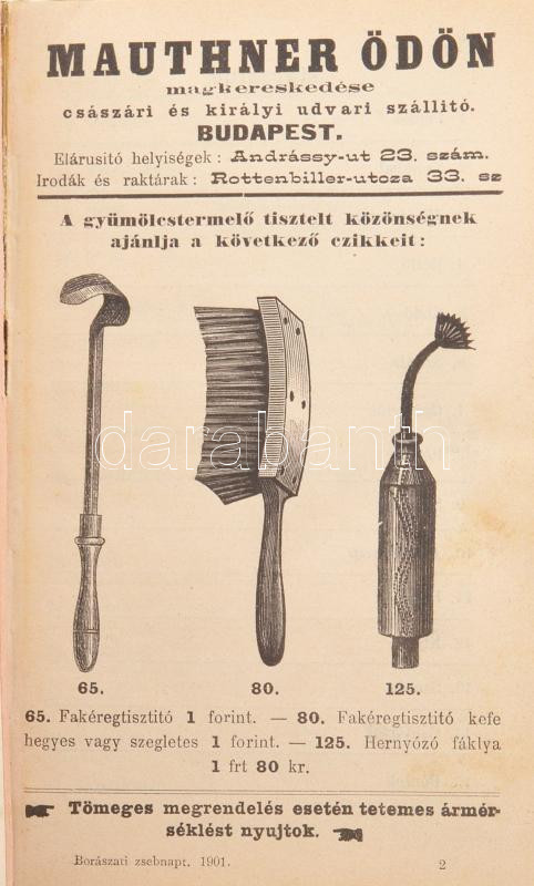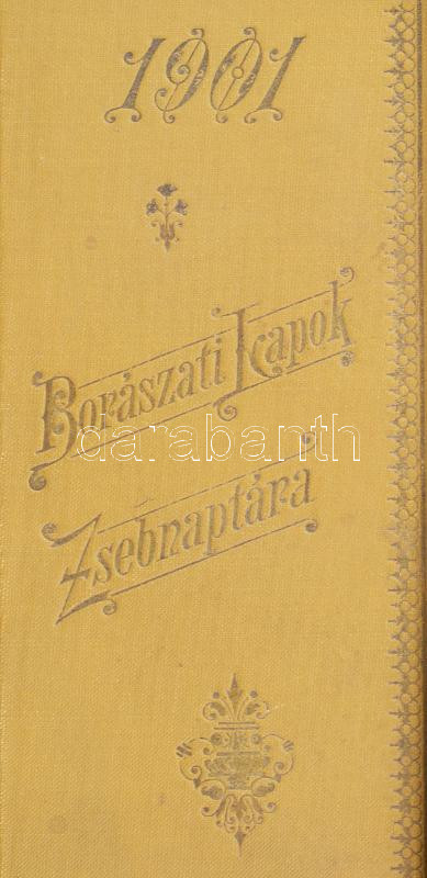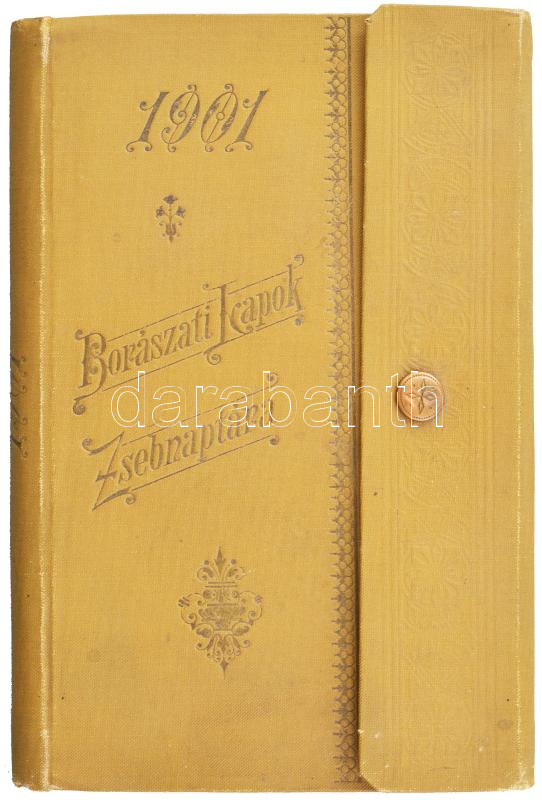 A "Borászati Lapok" zsebnaptára az 1901. évre. Szerk.: Drucker Jenő. Kiadja a "Borászati Lapok" kiadóhivatala. Második évfolyam. Bp., 1901, "Pátria", 2 sztl. lev.+ 296+2 p. + 12 sztl. lev. Kiadói félvászon-kötés, névbejegyzéssel, két lapon ceruzás jegyzettel, a kötés kissé sérült, az utolsó pár lap a kötésnél szakadt, a könyv végén a reklámok előtt (12 sztl. lev.) előtt pár lap hiányzik.