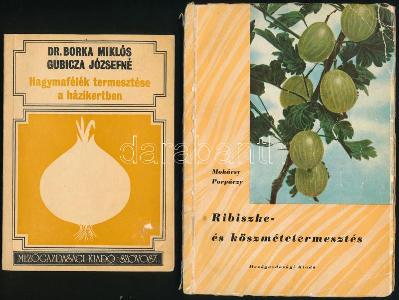 Mohácsy Mátyás - Porpáczy Aladár: A ribiszke és a köszméte termesztése. Bp., 1957., Mezőgazdasági. Kiadói papírkötésben, kopott borítóval, a borító sarkain gyűrődésnyomokkal, a gerincen kis szakadással. + Borka Miklós - Gubicza Józsefné: Hagymafélék termesztése a házikertben. Bp., 1979., Mezőgazdasági. Kiadói papírkötésben,