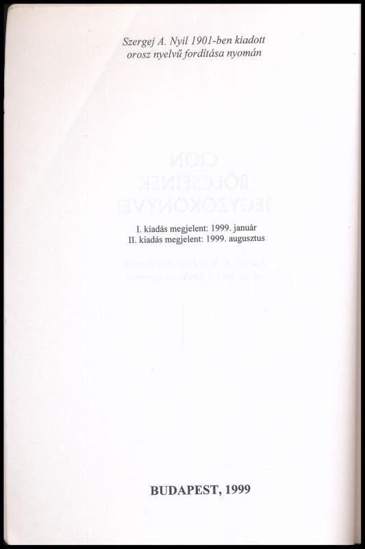 Cion bölcseinek jegyzőkönyvei. Bp., 1999, magánkiadás. Második kiadás.... https://www.darabanth.com/de/432-Fernauktion/432.0/Bucher/Bucher-Judaica~1000031/Cion-bolcseinek-jegyzokonyvei-Bp-1999-magankiadas-Masodik-kiadas-Kiadoi-papirkotes-~II2778469