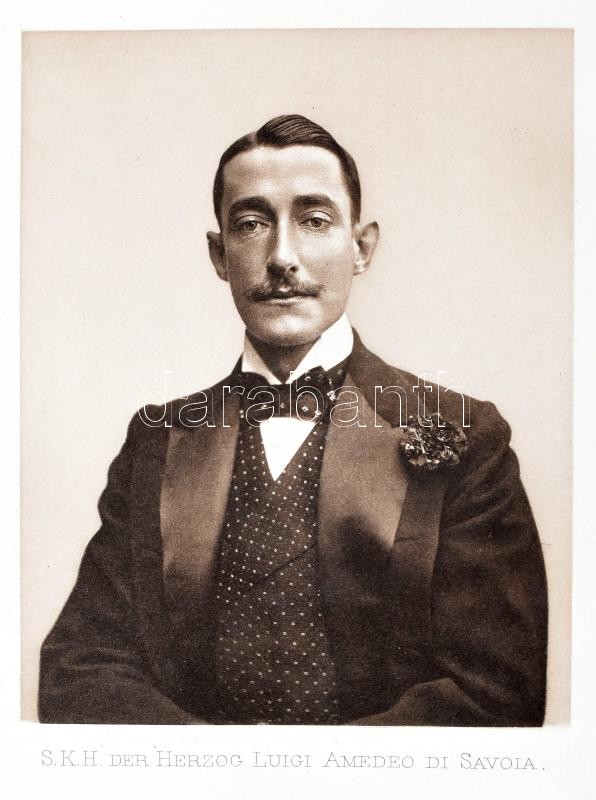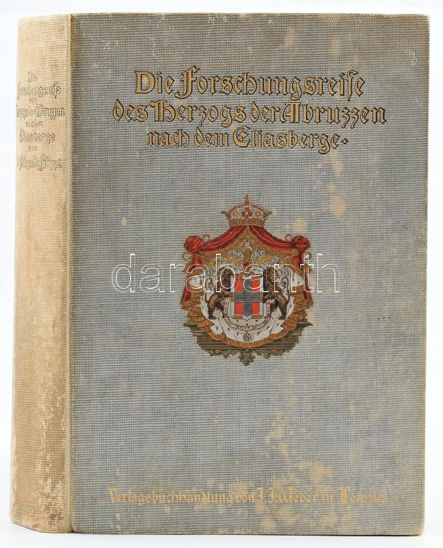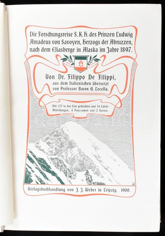 Filippi, Filippo de.: Die Forschungsreise S.K.H. des Prinzen Ludwig Amadeus von Savoyen, Herzogs der Abruzzen, nach dem Eliasberge in Alaska im Jahre 1897. Alaska, Leipzig, 1900. Weber, Aranyozott, festett, kopott egészvászon kötésben / In tattered full linen binding