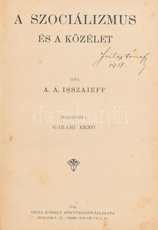 A. A. Isszaieff: A szociálizmus és a közélet. Ford.: Garami Ernő. Társadalomtudományi Könyvtár. Bp., 1910., Grill Károly. Átkötött kopott félvászon-kötés, kissé foltos lapokkal.