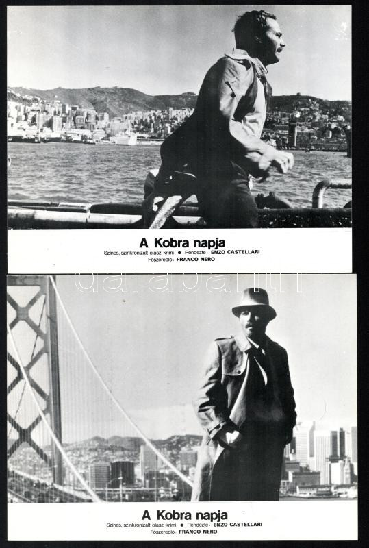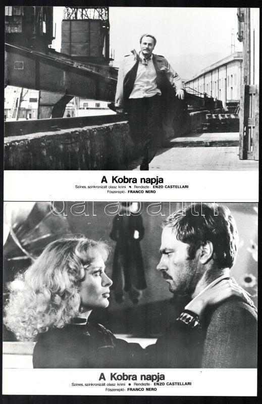 cca 1980 ,,A Kobra napja" című olasz film jelenetei és szereplői, 11 db produkciós filmfotó, nyomdai eljárással sokszorosítva, egyoldalas nyomás kartonlapra, a használatból eredő - esetleges - kisebb hibákkal, 18x24 cm