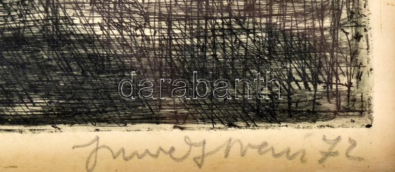 Beschreibung: Imre István (1918-1983): Dunapart (Budapest), 1972. Rézkarc, papír, jelzett. Üvegezett, dekoratív fakeretben, 58×69 cm