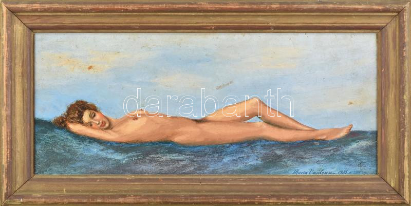 Beschreibung: Maria Vasilescu jelzéssel: Női akt. Olaj, farost. Apró felületi sérülésekkel. Dekoratív fakeretben, 23×53 cm
