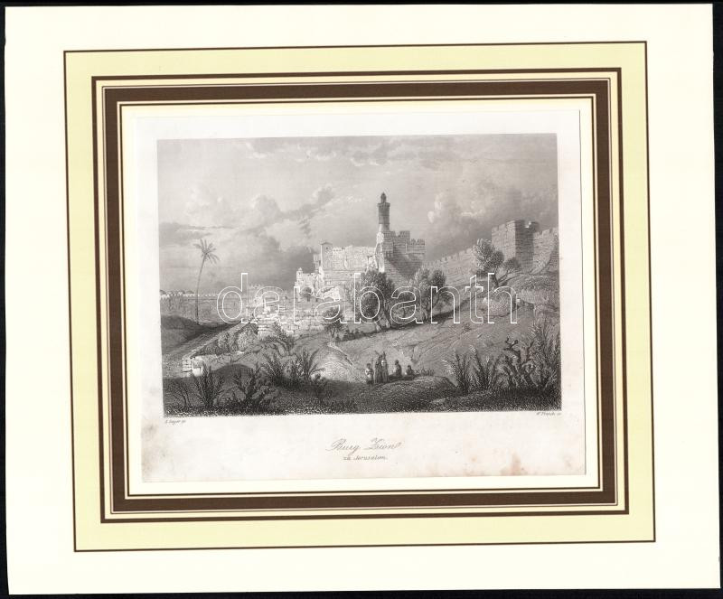 Alexius Geyer (1816-1883) festménye után, William French (1815-1898) metszése: Sion (Zion) vára, Jeruzsálem. Acélmetszet, papír, jelzett a metszeten. Paszpartuban. Kissé foltos. 14x20 cm.