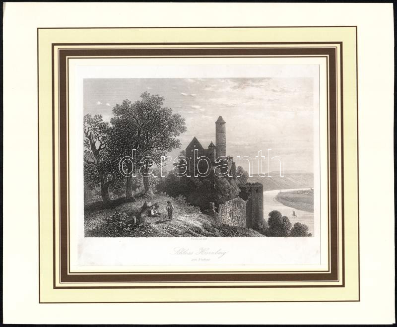 Beschreibung: Karl Friedrich Würthle (1820-1902): Hornberg kastélya, a Neckar mentén. Acélmetszet, papír, jelzett a metszeten. Paszpartuban. Kissé foltos. 14x20,5 cm.