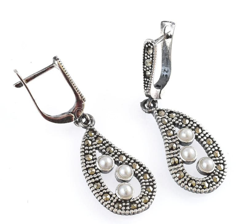 Beschreibung: Ezüst(Ag) csepp alakú fülbevalópár gyöngy és markazit díszítéssel, jelzett, h: 4 cm, bruttó: 7,1 g