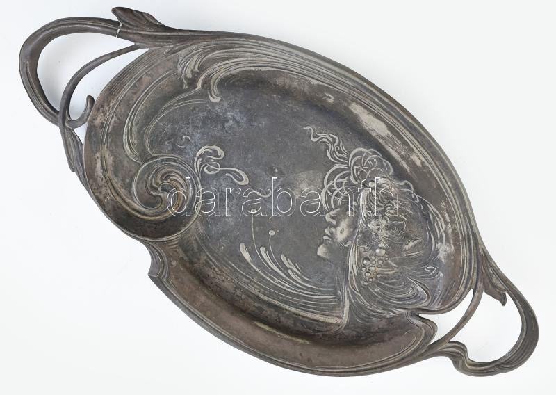 Szecessziós ón kínáló tálca. Női fejjel. Sérült 42x20 cm https://www.darabanth.com/de/432-Fernauktion/432.0/Kunst-Dokumente-andere-Sammelgebiete/Antik~500008/Szecesszios-on-kinalo-talca-Noi-fejjel-Serult-42x20-cm~II2788416