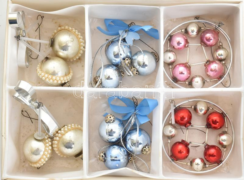Beschreibung: Karácsonyfadísz, 6db, üveg és fém, apró kopásnyomokkal, kartondobozban