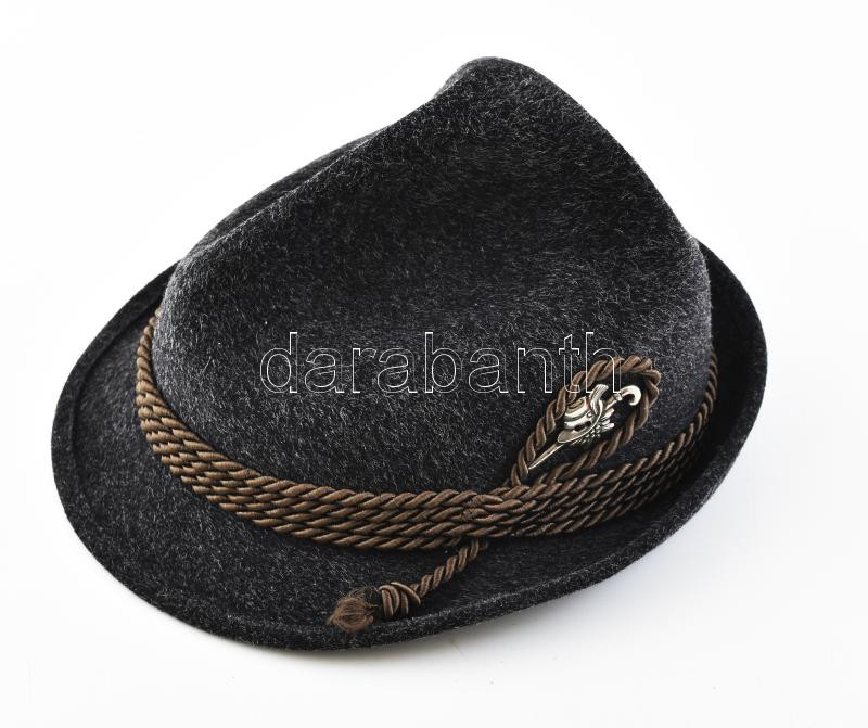 Beschreibung: Rein Haar vadászkalap, kitűzővel, zsinóros díszítéssel, 58-as méret.