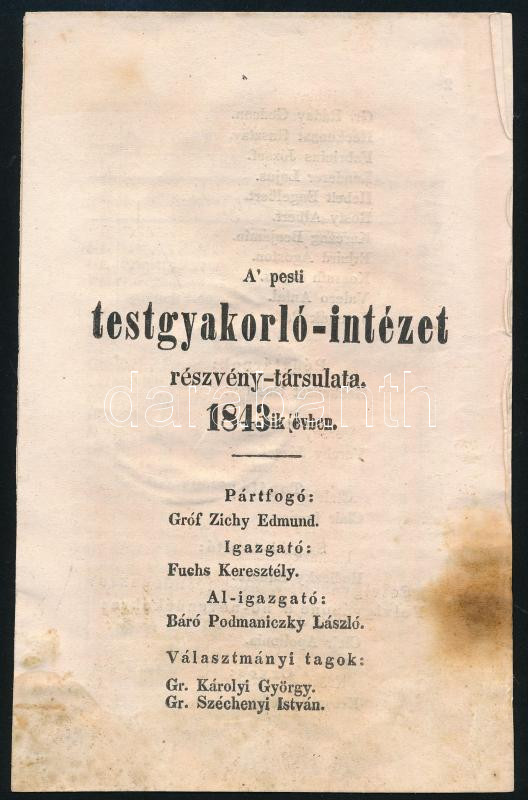 1843 A pesti testgyakorló intézet részvénytársulatának tájékoztató lap... https://www.darabanth.com/de/432-Fernauktion/432.0/Kunst-Dokumente-andere-Sammelgebiete/Drucksachen~1000002/1843-A-pesti-testgyakorlo-intezet-reszvenytarsulatanak-tajekoztato-lapja-foltos-6p~II2785403