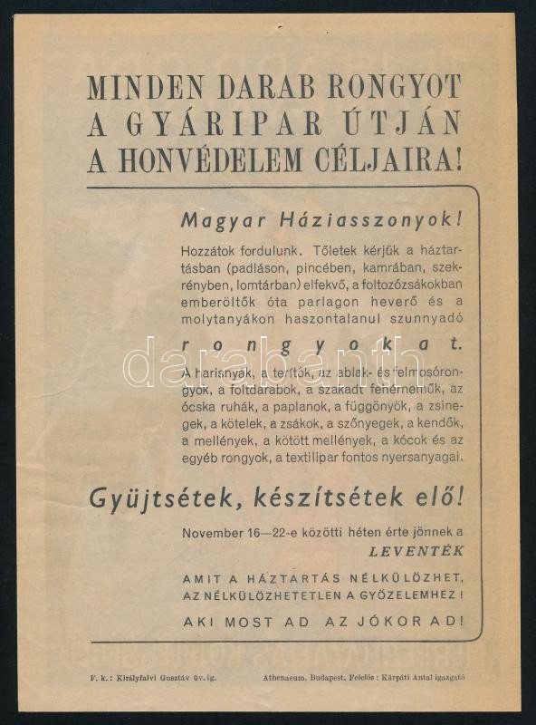 1943 "Te is add oda rongyaidat, mert ez hazafias kötelességed" - ruhagyűjtés a honvédelem céljaira, kétoldalas röplap, szign.: Kocsis. Bp., Athenaeum-ny. Jó állapotban, 20x14,5 cm