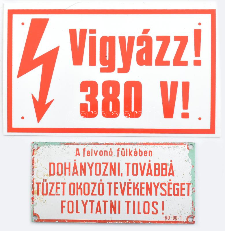2 db alumínium és műanyag tábla "Vigyázz! 380V!" és "A ... https://www.darabanth.com/de/432-Fernauktion/432.0/Kunst-Dokumente-andere-Sammelgebiete/Flohmarkt~500013/2-db-aluminium-es-muanyag-tabla-Vigyazz-380V-es-A-felvono-fulkeben-dohanyozni-tilos~II2786030