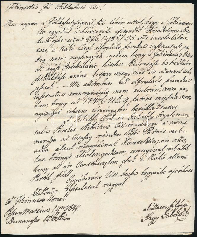 Beschreibung: 1847 Nagy Gábor táblabíró gyűjtő Kazinczy ügyvédje által írt levél