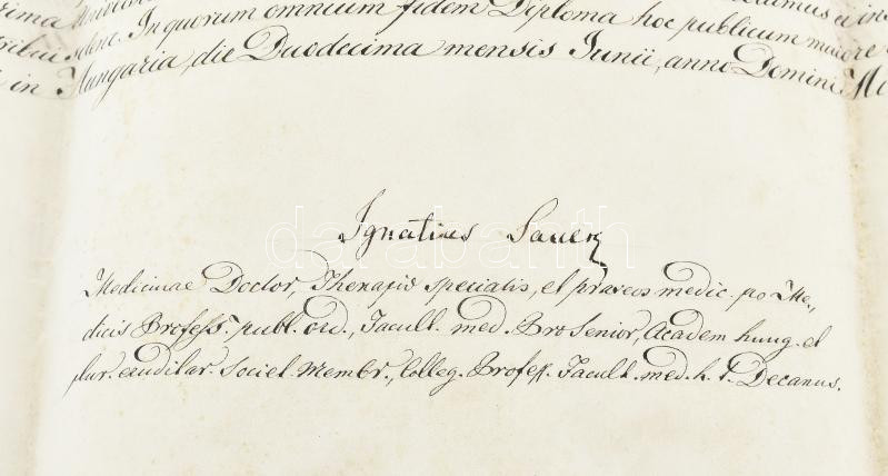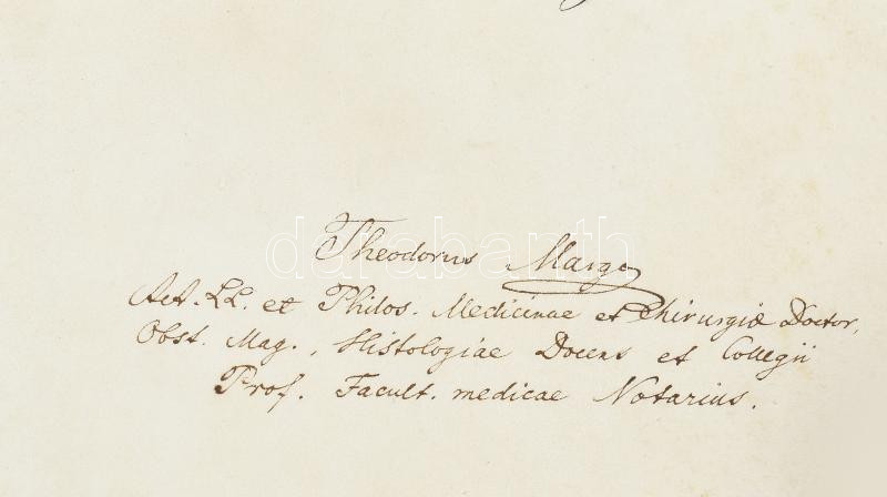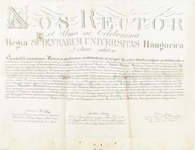 1860 Gráner Dávid (1829-1896) Pest vármegye későbbi, izraelita vallású (religionis mosaicae), zsidó származású tiszteletbeli főorvosának orvosdoktori, szülész magiszteri, és sebész doktori diplomája (...Medicinae Doctor et Artis Obstetriciae Magister, .., Doctorem Chirurgiae), rajta a Pesti Egyetem (a mai ELTE elődje) rektorának: Márkfi Sámuelnek (1811-1861), valamint az orvosi kar dékánjáank Sauer Ignác (1801-1863) és Margó Tivadar (1816-1896) orvos professzornak az aláírásaival. Pergamen, díszes, rézmetszetű fejléccel és címeres illusztrációval, áthúzott 72 kr. okmánybélyeggel, de függő pecsét nélkül, 46x60 cm. (Gráner-család később feltehetőleg Garamira változtatta a nevét.