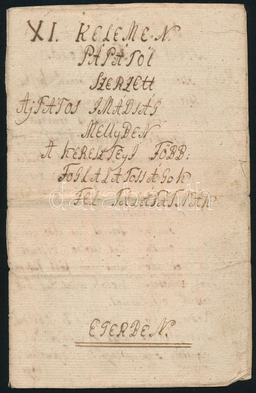 cca 1800 XI. Kelemen Pápától szerzett ájtatos imádság 8 kézzel beírt o... https://www.darabanth.com/de/432-Fernauktion/432.0/Kunst-Dokumente-andere-Sammelgebiete/Historische-Dokumenten-Handschriften~500020/cca-1800-XI-Kelemen-Papatol-szerzett-ajtatos-imadsag8-kezzel-beirt-oldalon~II2780579