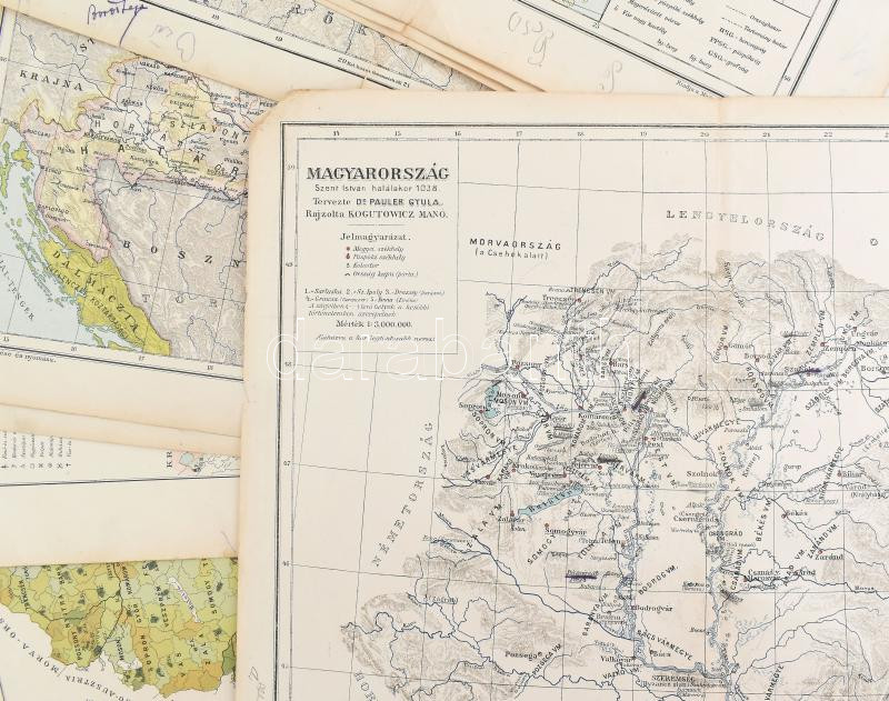 Beschreibung: cca 1900-1910 9 db Magyarország történeneti témájú térkép, rajzolta Kogutowicz Manó, Kissé szakadt lapszéllel. 30x35 cm.