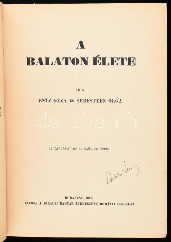 Entz Géza-Sebestyén Olga: A Balaton élete. Bp., 1942, Kir. Magyar Természettudományi Társulat, VIII+366 p.+XLIV t. Fekete-fehér fotókkal illusztrálva. Kiadói félvászon-kötés,