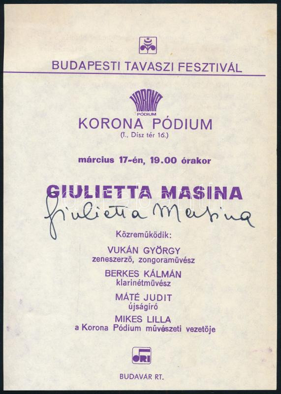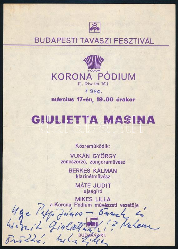 1998 Giulietta Masina és Mikes Lilla autográf aláírása budapesti tavas... https://www.darabanth.com/de/432-Fernauktion/432.0/Kunst-Dokumente-andere-Sammelgebiete/Signatur~500021/1998-Giulietta-Masina-es-Mikes-Lilla-autograf-alairasa-budapesti-tavaszi-fesztival-musor-fuz~II2785902