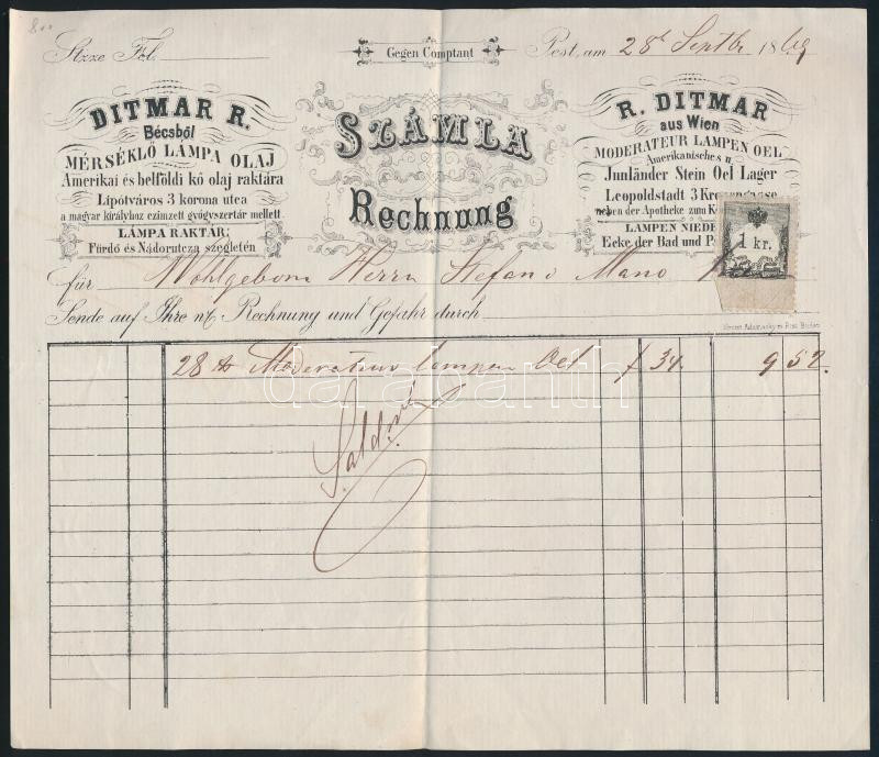 1864 Ditmar R. lámpaolaj bolt fejléces számla https://www.darabanth.com/de/432-Fernauktion/432.0/Kunst-Dokumente-andere-Sammelgebiete/Werbungen~500025/1864-Ditmar-R-lampaolaj-bolt-fejleces-szamla~II2788756