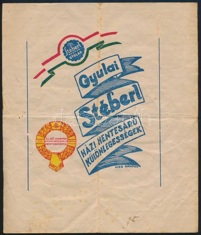 Gyulai Stéberl aranykoszorús hentesmester csomagolópapírja https://www.darabanth.com/de/432-Fernauktion/432.0/Kunst-Dokumente-andere-Sammelgebiete/Werbungen~500025/Gyulai-Steberl-aranykoszorus-hentesmester-csomagolopapirja~II2786471