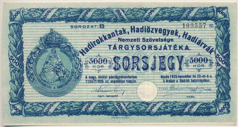 1925. "Hadirokkantak, Hadiözvegyek, Hadiárvák Nemzeti Szövetsége ... https://www.darabanth.com/de/432-Fernauktion/432.0/Numismatik/Aktien-und-Tickets~1500005/1925-Hadirokkantak-Hadiozvegyek-Hadiarvak-Nemzeti-Szovetsege-Targysorsjateka-sorsjegy-5~II2778905