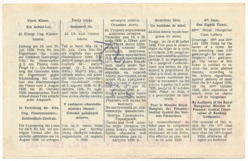 1939. "42. Osztálysorsjáték" 4. osztály 1/8 sorsjegy, "... https://www.darabanth.com/de/432-Fernauktion/432.0/Numismatik/Aktien-und-Tickets~1500005/1939-42-Osztalysorsjatek-4-osztaly-18-sorsjegy-A-sorozat-felulbelyegzessel-vizjel~II2782887