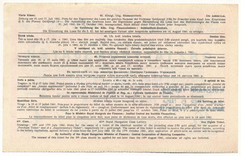 1941. "49. Osztálysorsjáték" 4. osztály 1/8 sorsjegy, "... https://www.darabanth.com/de/432-Fernauktion/432.0/Numismatik/Aktien-und-Tickets~1500005/1941-49-Osztalysorsjatek-4-osztaly-18-sorsjegy-F-sorozat-felulbelyegzessel-vizjel~II2782881