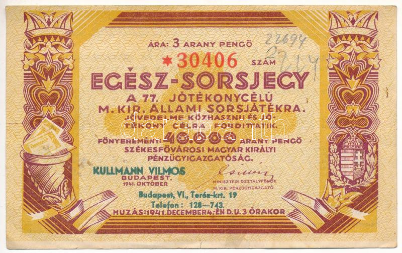 Budapest 1941. "Egész Sorsjegy a 77 Jótékonycélú M. Kir. Állami S... https://www.darabanth.com/de/432-Fernauktion/432.0/Numismatik/Aktien-und-Tickets~1500005/Budapest-1941-Egesz-Sorsjegy-a-77-Jotekonycelu-M-Kir-Allami-Sorsjatekra-sorsjegy-3P-e~II2782940