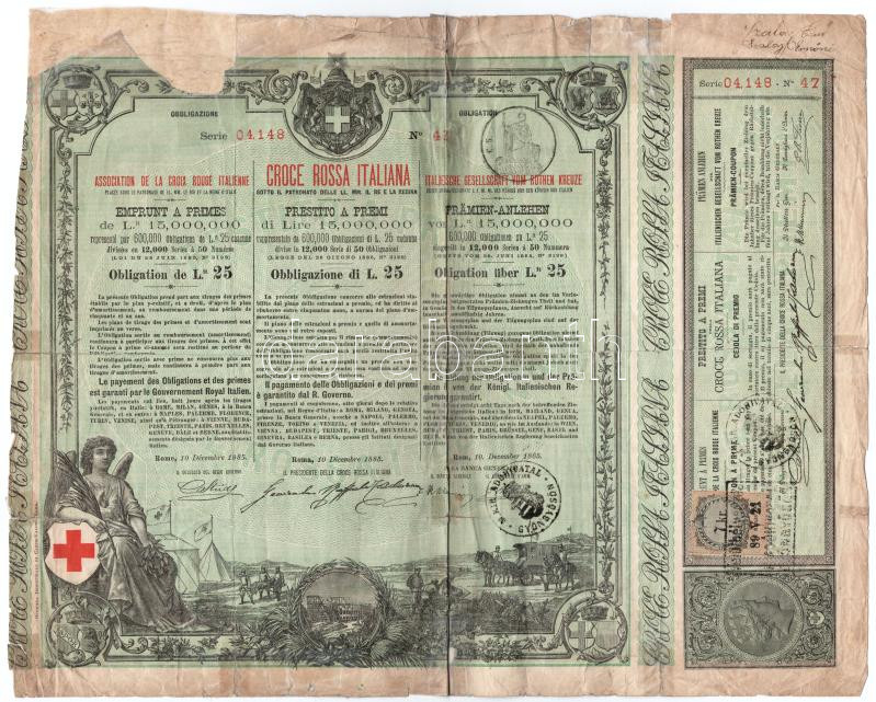 Olaszország / Róma 1885. "Olasz Vörös Kereszt" kötelezvény 25L értékben, három nyelven, bélyegzésekkel T:III- restaurált, ragasztott