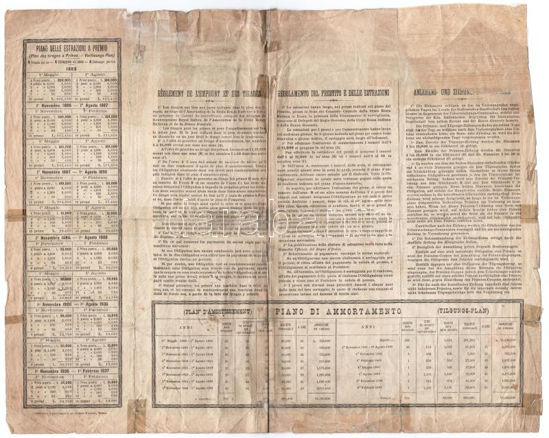 Italy / Rome 1885. "Italian Red Cross" obligation about 25 Lire, in three languages, with stamps C:VG restored, sticked