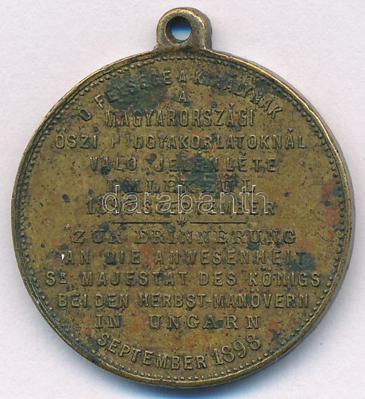 1898. "Ő Felsége a királynak a magyarországi őszi hadgyakorlatoknál való jelenléte emlékéül 1898 szeptember / Ferencz Joszef" kétoldalas, kétnyelvű vert emlékérem füllel T:3 patina, fo. 1898. "ZUR ERINNERUNG AN DIE ANWESHEIT SR. MAJESTAT DES KÖNIGS BEIDEN HERBST MANÖVERN IN UNGARN SEPTEMBER 1898" two sided, bilingual commemorative pendant C:F patina, spotted