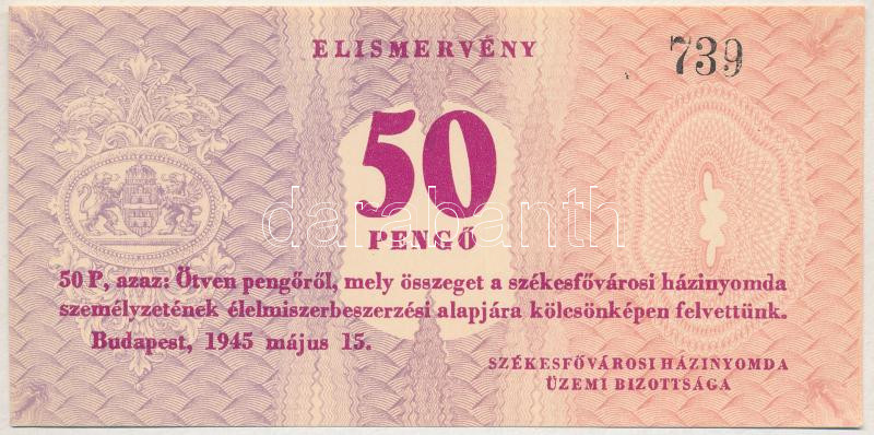 1945. "Székesfővárosi Házinyomda" elismervény 50P-ről "... https://www.darabanth.com/de/432-Fernauktion/432.0/Numismatik/Notgeld-aus-Papier-und-Metall~1500006/1945-Szekesfovarosi-Hazinyomda-elismerveny-50P-rol-739-sorszammal-TI-Adamo-BUP1012~II2778499