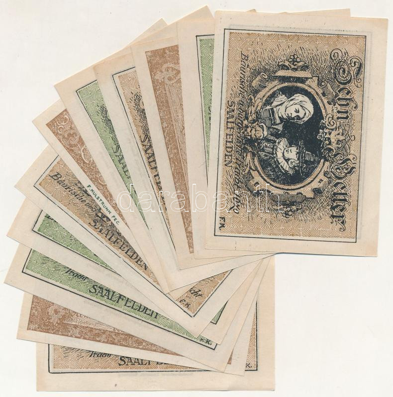 Ausztria / Saalfelden 1920. 10H (3x) + 20H (3x) + 25H (2x) +50H (3x) T... https://www.darabanth.com/de/432-Fernauktion/432.0/Numismatik/Notgeld-aus-Papier-und-Metall~1500006/Ausztria-Saalfelden-1920-10H-3x-plus-20H-3x-plus-25H-2x-plus50H-3x-T1-sarokhajtas-Austria-Sa~II2785232