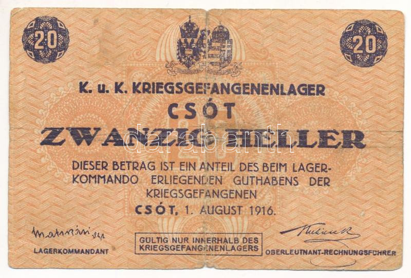 Csót / Hadifogolytábor 1916. augusztus 1. 20f sorozatszám nélkül T:III... https://www.darabanth.com/de/432-Fernauktion/432.0/Numismatik/Notgeld-aus-Papier-und-Metall~1500006/Csot-Hadifogolytabor-1916-augusztus-1-20f-sorozatszam-nelkul-TIII-Adamo-HHC-132~II2780110