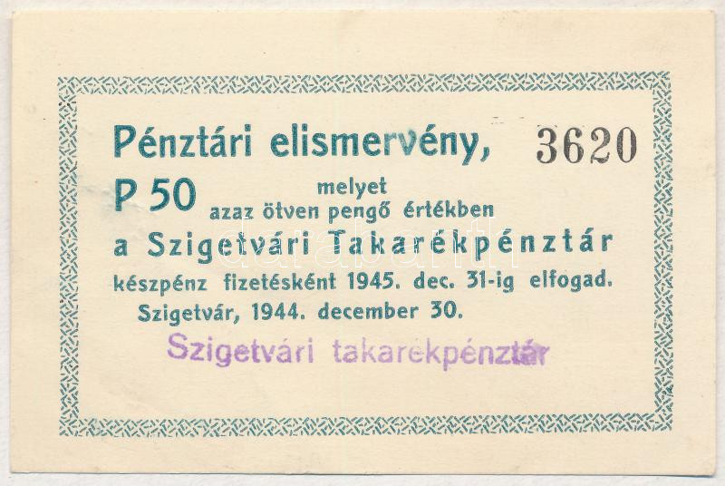 Beschreibung: Szigetvár 1944. 50P pénztári elismervény"3620" "Szigetvári takarékpénztár" felülbélyegzéssel T:I- Adamo SZV2.6