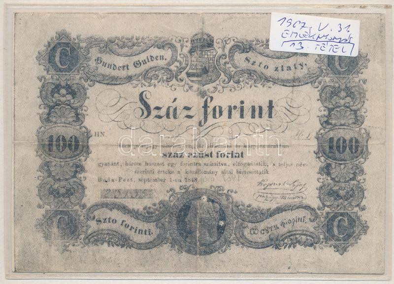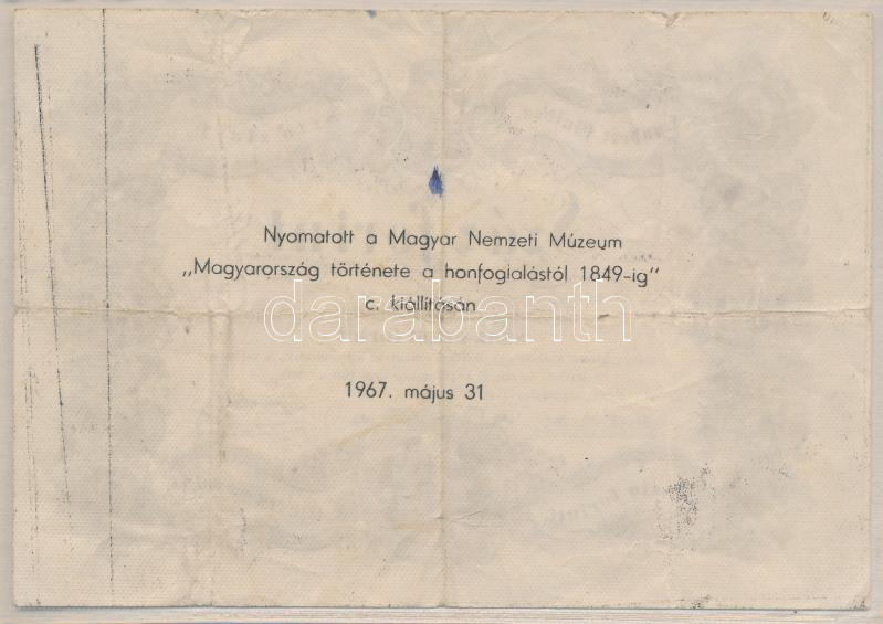 1848. 100Ft "Kossuth bankó" imitációja, hátoldalán "Nyomatott a Magyar Nemzeti Múzeum Magyarország története a honfoglalástól 1849-ig c. kiállításon 1967. május 31." Lezárt fóliatokban T:III