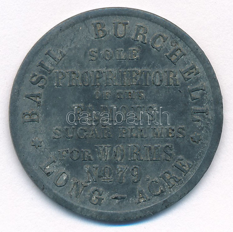 Great Britain ~1780. Basil Burchell, english seller of medicaments and goldsmith's two-sided Zn advertising token "BASIL BURCHELL SOLE PROPRIETOR OF THE ANODYNE NECKLACE FOR CHILDREN CUTTING-TEETH / BASIL BURCHELL SOLE PROPRIETOR OF THE FAMOUS SUGAR PLUMBS FOR WORMS NO. 79 - LONG ACRE" (29mm) C:XF patina