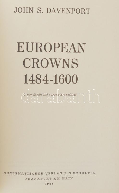 John S. Davenport: European Crowns 1484-1600. Második, javított és bővített kiadás. Numismatischer Verlag, Frankfurt, 1985. Újszerű állapotban, a keménykötéses borítón pár kis benyomódás / John S. Davenport: European Crowns 1484-1600. 2nd, revised and enlarged edition. Numismatischer Verlag, Frankfurt, 1985. In mint condition, a few small dents on the hardcover.