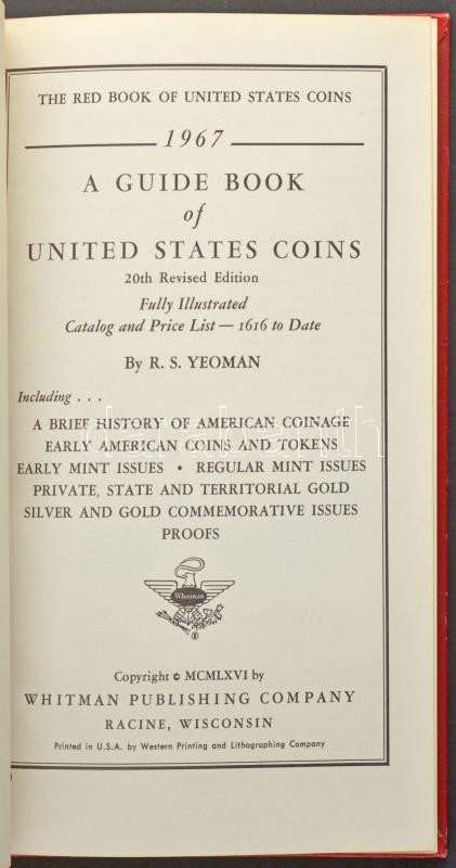R. S. Yeoman: A Guide Book of United States Coins 1967 (Útmutató az Amerikai Egyesült Államok érméihez). 20. átdolgozott kiadás, Whitman Publishing Company, Wisconsin, 1966. Használt állapotban, a lapokon ragasztónyomok.
