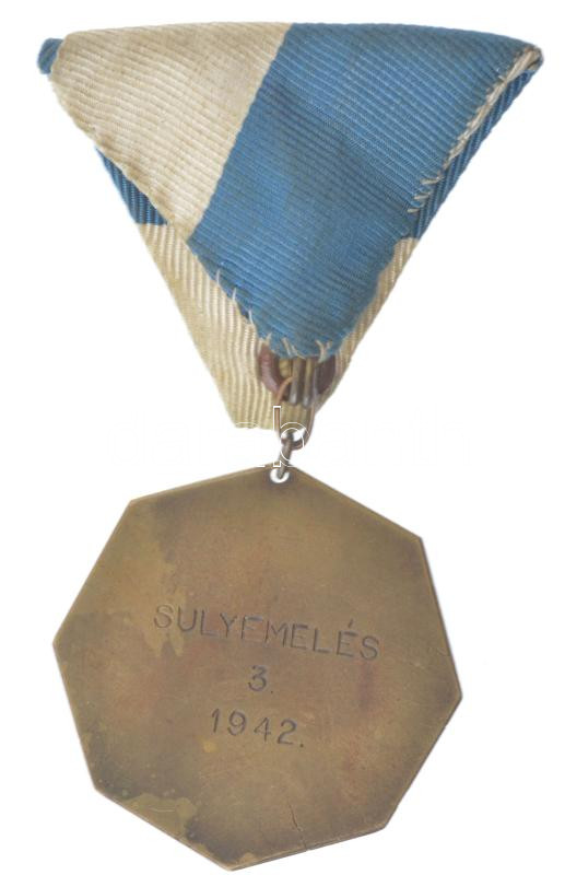 Beschreibung: Berán Lajos (1882-1943) 1942. "Magyar Királyi Államvasutak Sportegyesületeinek Ligája" bronz díjérem mellszalagon, hátoldalán "Súlyemelés 3. 1942." gravírozással (36mm) T:2,2- patina, repedés