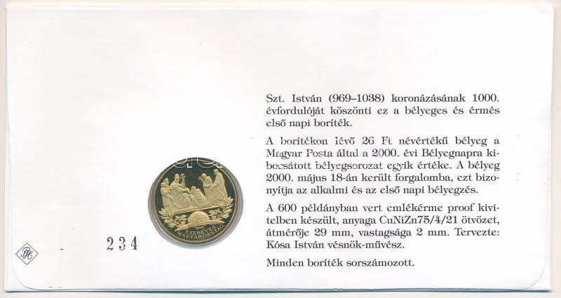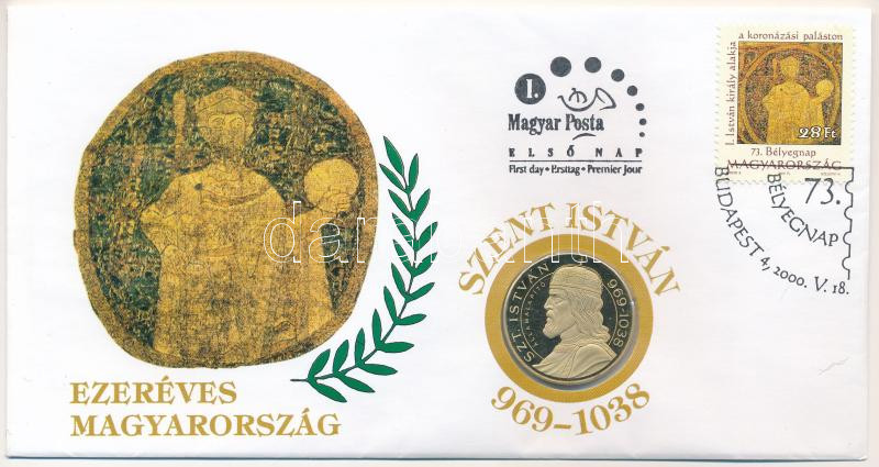 Magyarország 2000. "Ezeréves Magyarország / Szent István" aranyozott alpakka emlékérem borítékban, első napi bélyegzővel és "73. Bélyegnap - Budapest" bélyeggel, "234"-es sorszámmal, magyar nyelvű leírással T:PP