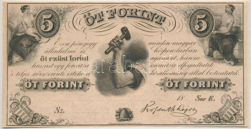 1852. 5Ft "Kossuth bankó" kitöltetlen "E",T:I Hung... https://www.darabanth.com/de/432-Fernauktion/432.0/Numismatik/Ungarische-Banknoten~1500007/1852-5Ft-Kossuth-banko-kitoltetlen-E-TI-Hungary-1852-5-Forint-E-without-date-and-serial-n~II2777668