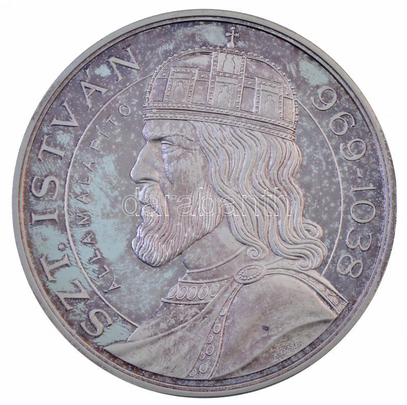 Kósa István (1953-) 2000. "Szent István államalapító 969-1038 / Ezeréves Magyarország" Ag emlékérem dísztokban, tanúsítvánnyal (124,61g/0.999/65mm) T:PP patina, ujjlenyomat / Hungary 2000. "Saint Stephen 969-1038 / 1000th Anniversary of the Hungarian State" Ag commemorative medallion in hardcase with certificate. Szign.: István Kósa (124,61g/0.999/65mm) C:PP patina, fingerprints