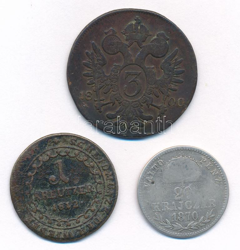 Beschreibung: 1800E 3kr Cu "I. Ferenc" Gyulafehérvár + 1812E 1kr Cu "I. Ferenc" Gyulafehérvár + 1870GYF 20kr Ag "Ferenc József / Váltó Pénz" Gyulafehérvár T:3 patina, az egyiken karc