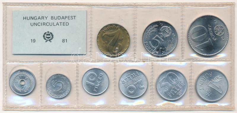 1981. 2f-10Ft (9xklf) érmés forgalmi sor fóliatokban, benne "FAO&... https://www.darabanth.com/de/432-Fernauktion/432.0/Numismatik/Ungarische-Munzen-und-Munzen-mit-ungarischem-Munzzeichen~1500008/1981-2f-10Ft-9xklf-ermes-forgalmi-sor-foliatokban-benne-FAO-10Ft-T1-patina-Adamo-FO14~II2784014