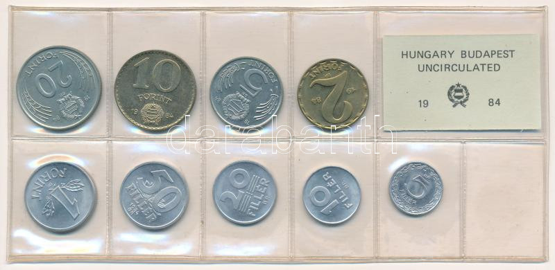 1984. 5f-20Ft (9xklf) érmés forgalmi sor fóliatokban (2f érme hiányzik... https://www.darabanth.com/de/432-Fernauktion/432.0/Numismatik/Ungarische-Munzen-und-Munzen-mit-ungarischem-Munzzeichen~1500008/1984-5f-20Ft-9xklf-ermes-forgalmi-sor-foliatokban-2f-erme-hianyzik-T1-patina-Adamo-FO17~II2784026