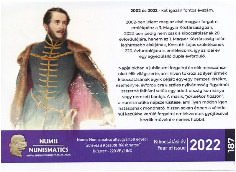 Beschreibung: 2002. 100Ft "Kossuth"' "20 éves a Kossuth 100 forintos 2022" bliszterben, "187" sorszámmal T:2